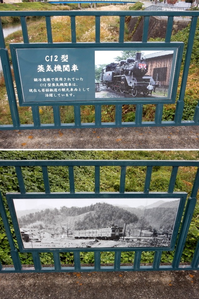 欄干には鍛冶屋線を走ったC12型蒸気機関車と、現役時代の気動車