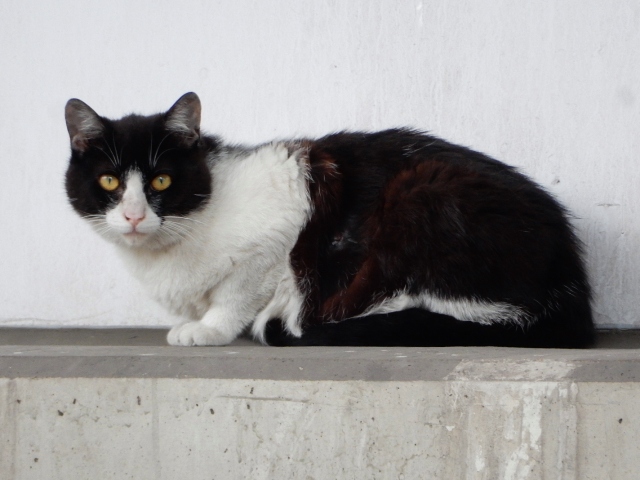 片上鉄道のホトフ駅長に似た白黒の八割れさんです。