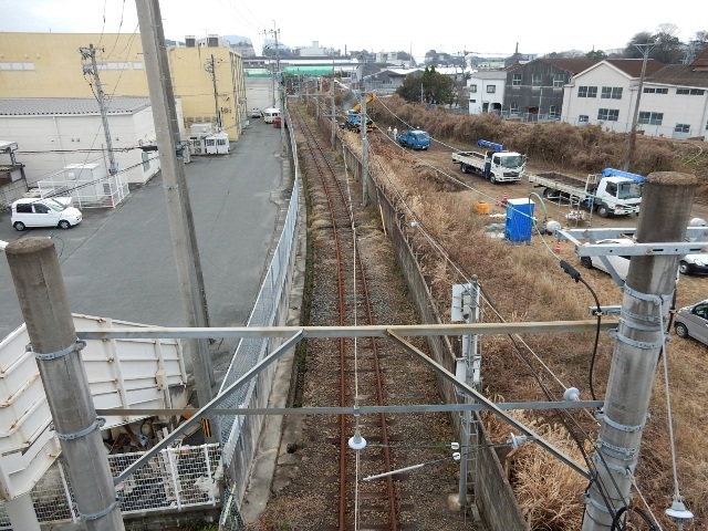 炭鉱鉄道の廃線跡、その先が荒尾駅です。一時期はココの立体交差