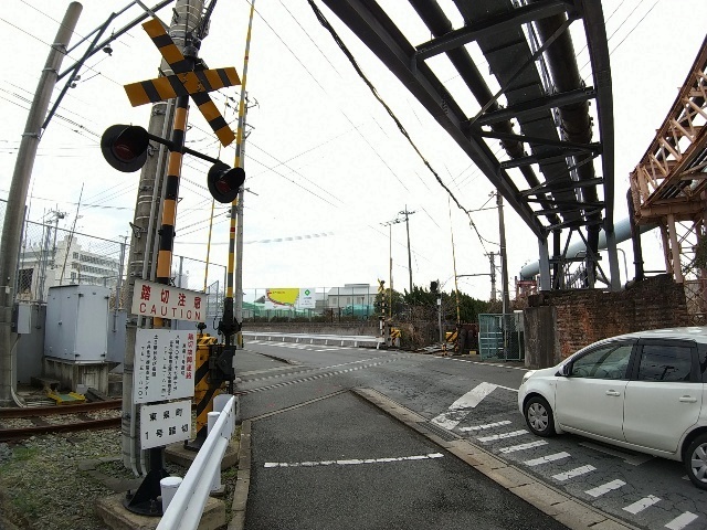 工場へ入る広い踏切の前後がフェンスで閉じられていましたが、
