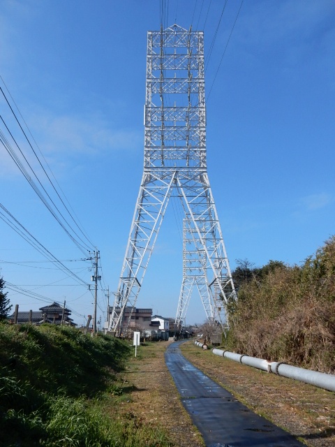 C 送電線の鉄塔の股の下を走っている。