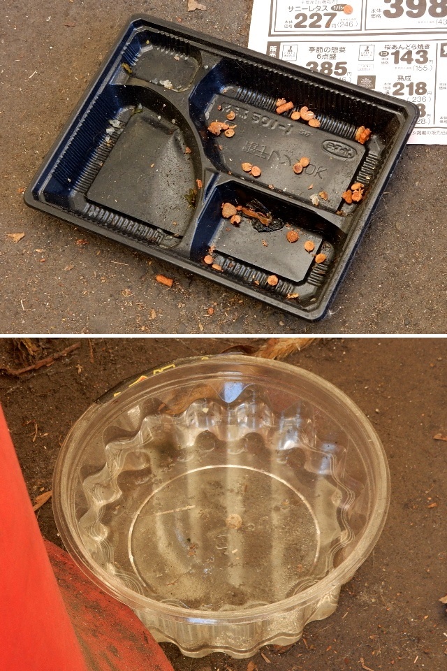 カリカリの食べ残しやお水の入った容器が置かれています。