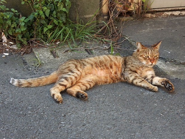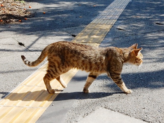 キジトラさんが建物の日陰に収まりました。…ウチの猫キャラは3匹
